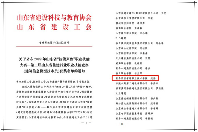 本网讯(酒店工程学院 赵炜)近日,2022年山东省“技能兴鲁”职业技能大赛——第二届山东省住建行业职业技能竞赛(建筑信息模型技术员)顺利结束,永利官网酒店工程学院赵炜老师荣获职工组二等奖。