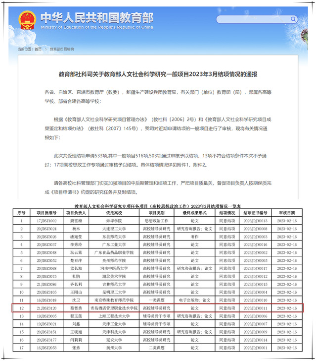 此次教育部社科司共受理结项申请533项,其中一般项目516项,503项通过审核予以结项;17项高校思政工作专项通过审核予以结项。