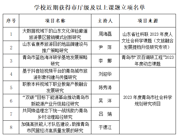 本网讯(科研发展处)近期,山东省人文社会科学课题管理办公室等部门公布了2023年度相关课题立项名单,永利官网共计立项8项课题,其中,山东省社科联2023年度人文社会科学课题(文旅融合发展提档升级研究专项)2项、青岛市“双百调研工程”2023年度动态课题1项、2023年度青岛市社会科学规划研究项目5项。