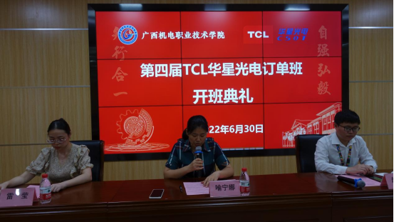 典礼上,学院副院长喻宁娜发表讲话,她对企业领导的到来和对学院的大力支持表示衷心的感谢,向进入第四届华星光电订单班的同学表示热烈的祝贺。她说,第四届TCL华星光电订单班的开班,代表“校企合作,订单培养”的高职院校人才培养的重要模式,这种模式,国家提倡、企业认同、学院支持、学生及家长满意。实践证明,这是高职院校有效的人才培养模式,也是企业有效的人力资源开发模式。学院与企业建立良好的合作关系,是实现双方共同发展的必由之路。订单班的成立为校企深度合作搭建了良好的平台。依托这个平台,学院将加快推进人才培养模式改革、课程体系建设、企业文化和学校文化的融合等方面的步伐,提高人才培养的质量,从而更好地为企业持续发展提供强有力人力支撑。为推进订单班工作的开展,喻副院长提三点建议: