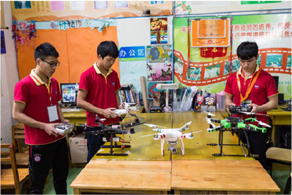 电子科技协会会员在操控“四轴飞行器”和“无人机”