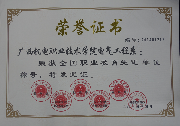 2014年电气工程学院被国家授予“全国职业教育先进单位”荣誉称号