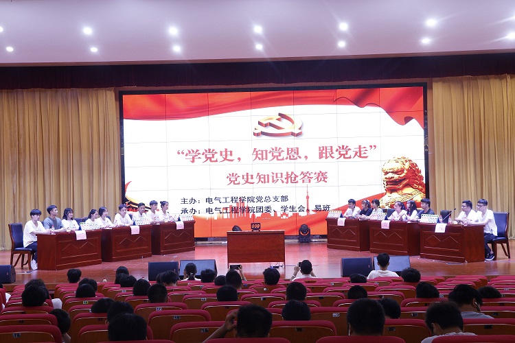 为庆祝中国共产党成立100周年,持续推进党史学习教育走深走实,引导广大青年学生从百年党史中汲取智慧和力量。6月29日,由电气工程学院党支部举办的“学党史、知党恩、跟党走”党史知识竞赛总决赛在博园楼小礼堂举行。此次党史知识竞赛题目内容丰富、知识覆盖面广,设置必答题、抢答题、风险题等多个环节,多维度检验当代大学生党史学习教育成果。 经过前期的初赛选拔,6支队伍共计18人分别从2000余名学生中脱颖而出,参加本次现场决赛。