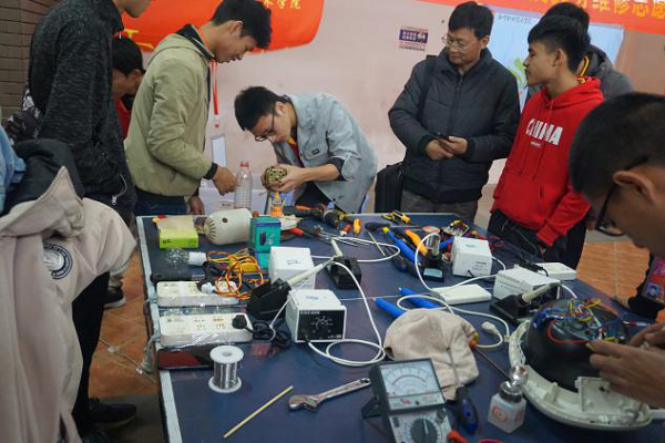 2019年12月1日我系电子科技协会与南宁职业技术学院电子科技协会的同学们在西乡塘区学府大道开展了以义务维修为主题的技术交流联谊活动,将便民服务送进社区。