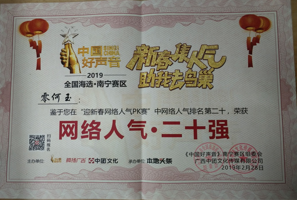 近日,我院电气工程系电子信息工程技术专业2016级学生零何玉参加由《2019中国好声音》南宁赛区组委、广西中团文化传播有限公司举办的迎新春网络人气PK赛中网络人气排名第二十名,荣获“网络人气·二十强”,这是该学生继去年10月2日参加中国好声音全国海选南宁赛区获晋级后,又喜获的佳绩。