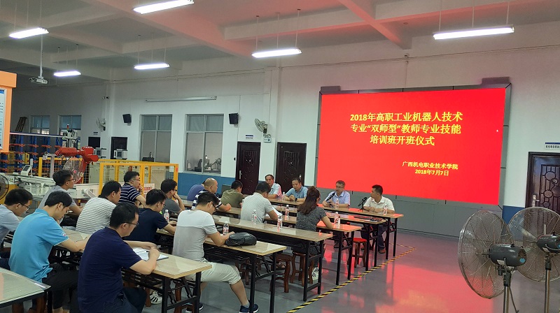 77日,2018年“双师型”教师专业技能培训(高职工业机器人技术)班在我系智能制造应用技术中心开班来自南宁职业技术学院、柳州职业技术学院、柳州铁道职业技术学院、广西生态工程职业技术学院、北海职业学院、广西电力职业技术学院等广西各地6所高职院校的25名老师接受本次培训。