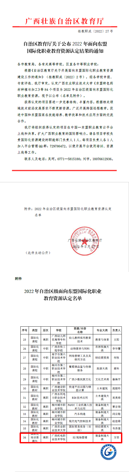 近日,自治区教育厅公布了2022年自治区级面向东盟国际化职业教育资源认定名单”,我院方羽副教授主持的《5S现场管理》资源包被认定为自治区级面向东盟国际化职业教育国际化培训资源包。本次认定的教育资源是自治区教育厅首批认定的区级面向东盟国际化职业教育资源。