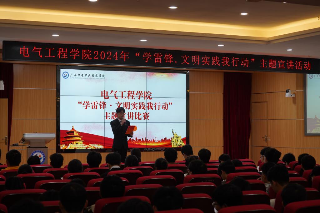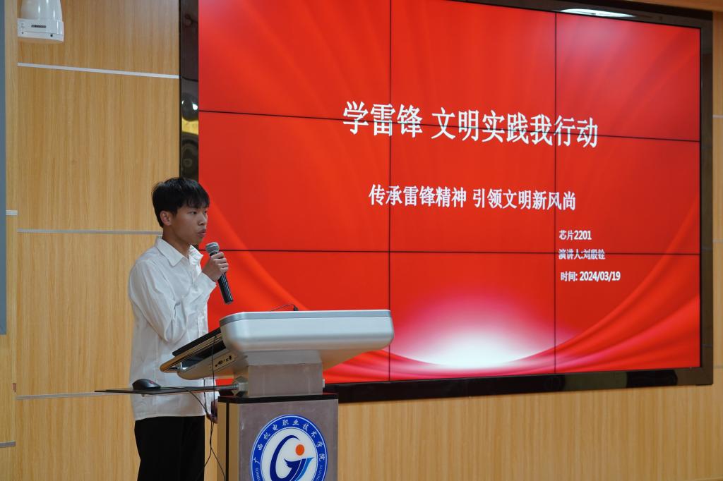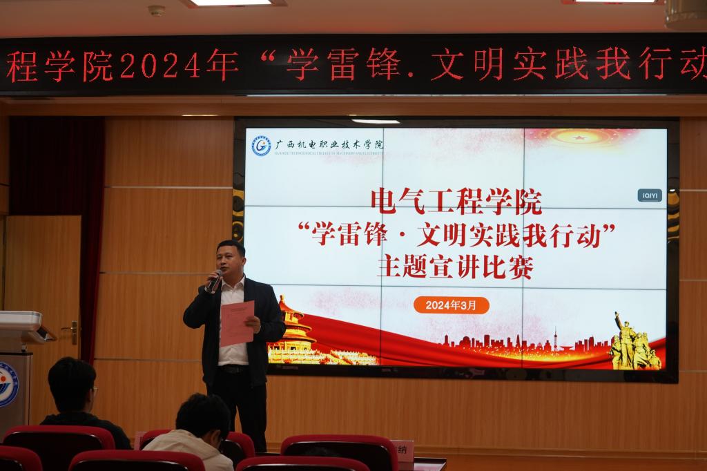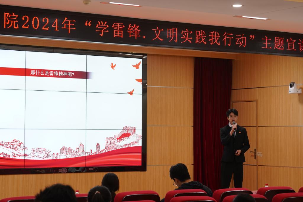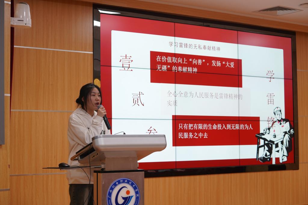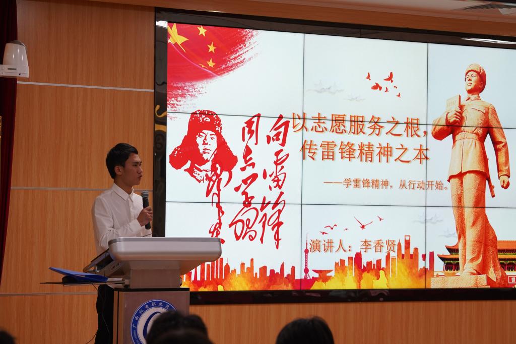 为深入学习贯彻党的二十大精神和习近平总书记关于学雷锋志愿服务的重要论述,引导和号召广大青年学生深刻把握雷锋精神的丰富内涵和实践要求,传承和践行雷锋精神,用宣讲促实际行动,深入推动学院精神文明建设走深走实,2024年3月19日晚,我院在博远楼1号报告厅隆重举行“学雷锋·文明实践我行动”主题宣讲比赛。我院团委书记陈婷、专任教师欧道源、学生第二党支部书记朱椿燕、学生第二党支部宣传委员吴文静担任评委,我院党委副书记覃伟纳出席比赛。