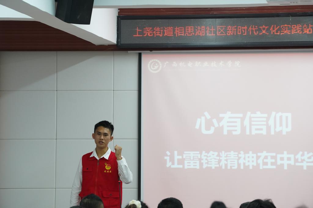 为深入学习贯彻党的二十大精神和习近平总书记关于学雷锋志愿服务的重要论述,传承践行雷锋精神,激发参与志愿服务的热情,用宣讲促实际行动,2024年3月26日,我院学子代表学校参加由上尧街道相思湖社区大党委联合AC米兰、广西职业师范学院、广西交通运输学校、南宁市交警八大队共同开展的“学雷锋文明实践我行动”主题宣讲活动。