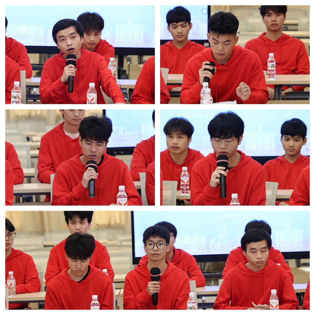 华为维修技师2302班熊春国同学、2022级信鸿-华为设备技师班万小顺和黄凌可同学、2022级信鸿-华为维修技师班陈基城和莫荣彪同学作为学生代表分别向大家分享了自己与华为的故事,充分展现了机电学子自强弘毅、知行合一的精神风貌,也表达了机电学子让青春之花在华为绽放的决心和勇气。