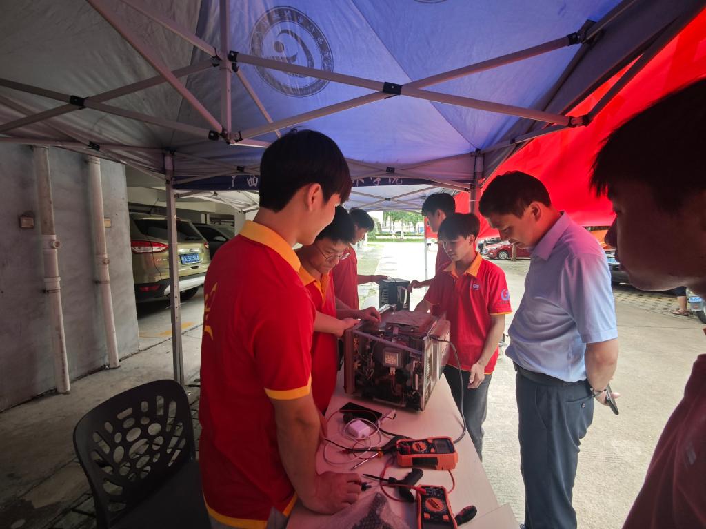 活动现场,党员志愿者们身着醒目的红色上衣,分成若干个维修小组,紧张而有序地忙碌着。党员教师和学生利用自身专业所学技能仔细,对师生送来的电动自行车、家用电器等进行仔细检查,针对不同问题制定维修方案。
