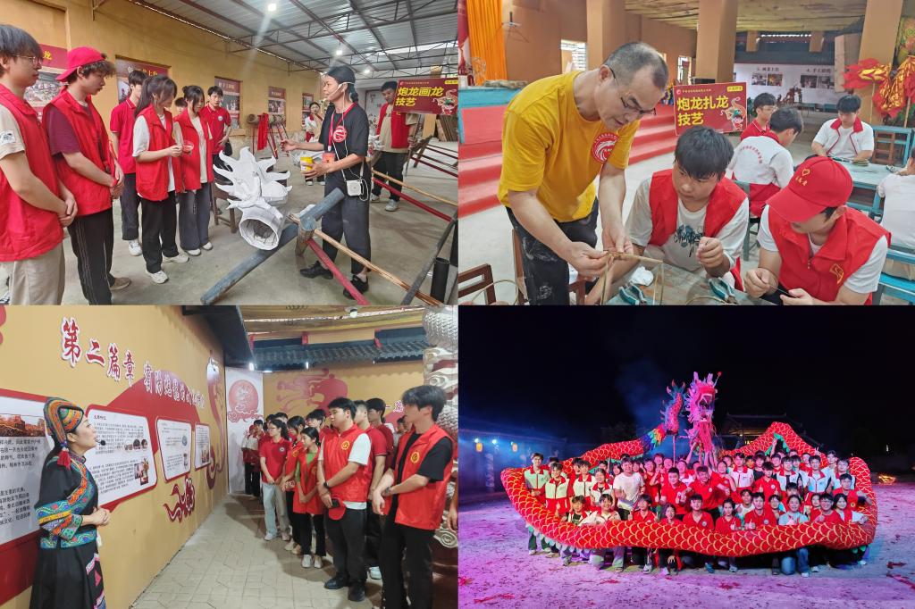 宾阳县被誉为“中国炮龙之乡”。宾阳炮龙节是汉、壮民族文化融合的民间节庆,至今已有千年历史,为国家级非物质文化遗产。最后一站,实践团深入万兴炮龙文化园,进一步感受宾阳民俗文化的无穷魅力。成员们参观了宾阳炮龙非遗展馆,深入了解了炮龙的起源、发展和传承;参与了“东方狂欢节”——宾阳炮龙,深刻体悟这一独具特色的非遗民俗文化之精彩。炮龙传承人还带领实践团成员分别体验了画龙、扎龙、舞龙和打鼓四项技艺。成员们扎龙爪、剪龙头、画龙鳞、贴龙鳞、做龙珠,还手持龙柄认真学习舞龙、手拿鼓槌练习传统鼓的敲打节奏,最后以小组为单位进行汇报演出,在沉浸式体验非遗传统民俗文化中,更加坚定文化自信,自觉传承和弘扬优秀传统文化。