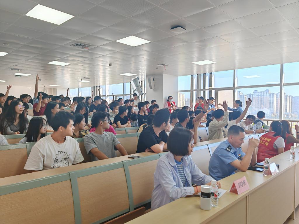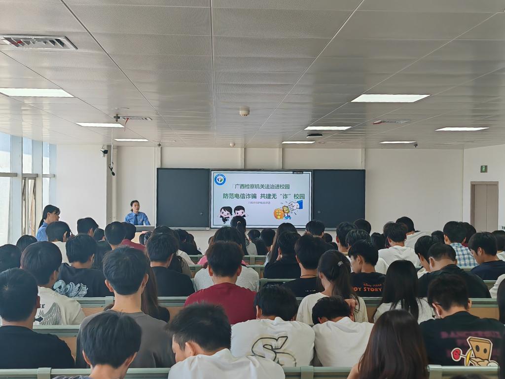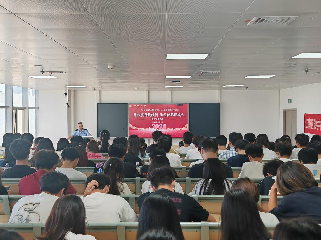 为广泛深入开展法治教育,进一步提高广大青年的法律意识和安全意识,引导广大青年学会用法律保护自己,远离电信诈骗、邪教、毒品的危害,防范校园欺凌,推进依法治校,共建和谐平安校园,11月1日下午,电子信息工程学院、人工智能技术学院联合华南社区共同开展“普法宣传进校园 法治护航伴成长”宣讲活动。
