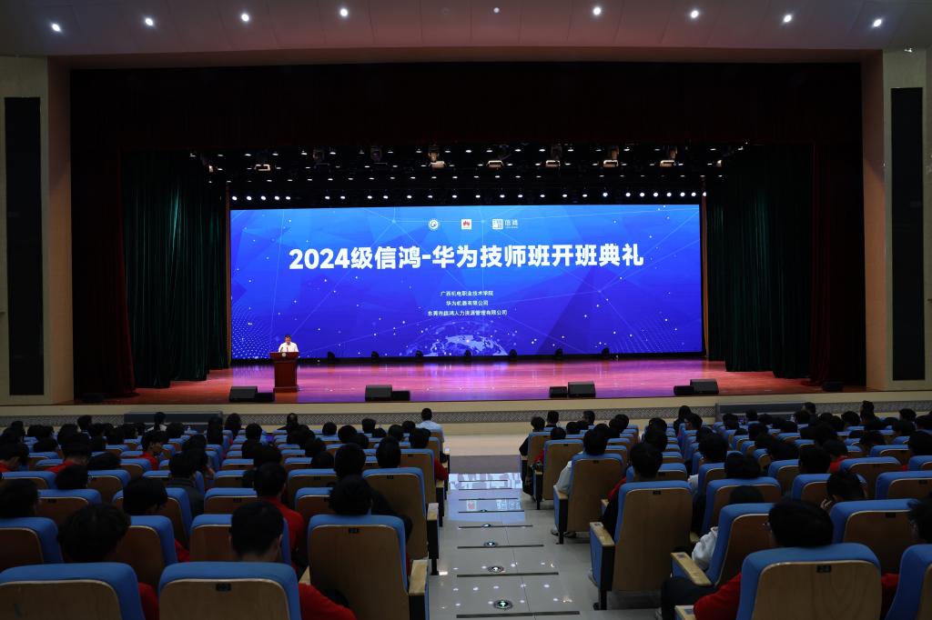 东莞市信鸿人力资源管理有限公司总经理葛更辉在致辞中表示,从2008年合作至今,技师班涌现出了一批受到企业赞誉的复合型技能人才。此次开班标志着广西机电、华为和信鸿持续深化高质量合作,促进三方产教融合,共同打造合作办学的示范样板。他希望进入新一届技师班的同学能够珍惜这个来之不易的机会,勤学苦练,扎根技术,勇于创新。他表示,信鸿公司将主动前置各项服务,努力将联合办学共同体建设推向更高水平,在新质生产力时代,为同学们兑现工程师红利,为校企合作各方努力注入新的合作动能。