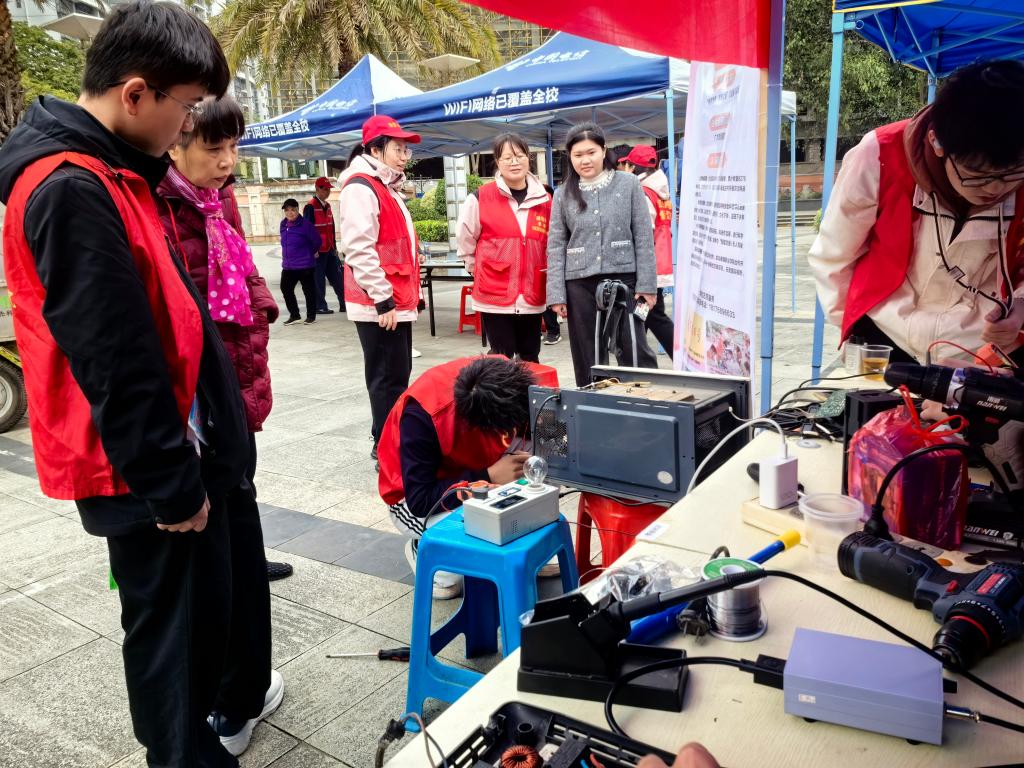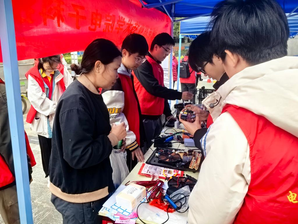 活动过程中,学生第一、第二党支部教师和“全国青年文明号”——电子科技协会师生志愿者在仁和路肯德基榕树广场驻点接收群众送来的废旧家电进行维修。本次活动共接收旧家电20余件,维修成功率达80%以上,获得广大群众的一致好评。