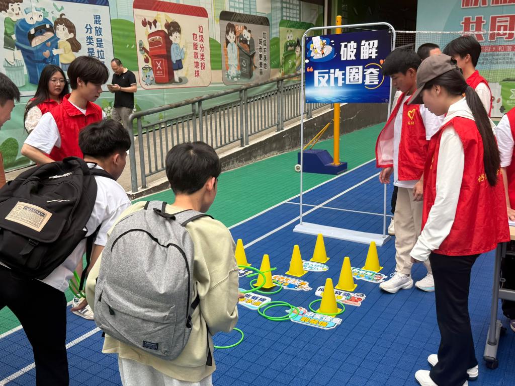 活动现场,“破解‘反诈圈套’”的套圈游戏吸引了众多同学的目光。工作人员别出心裁地将反诈知识与传统套圈游戏相结合,在场地中摆放多个反诈警示牌,“个人信息勿泄露”“社交软件防陷阱”“兼职刷单都是坑”等标语醒目可见。同学们手持套圈,全神贯注地瞄准目标,力求一击即中。每当有同学成功套中立牌,工作人员便立即针对立牌上的反诈警示语展开简要讲解与提醒。这种寓教于乐的方式,让同学们在欢声笑语中深刻认识到了各类诈骗手段的危害,防骗反诈的警钟在心中长鸣。