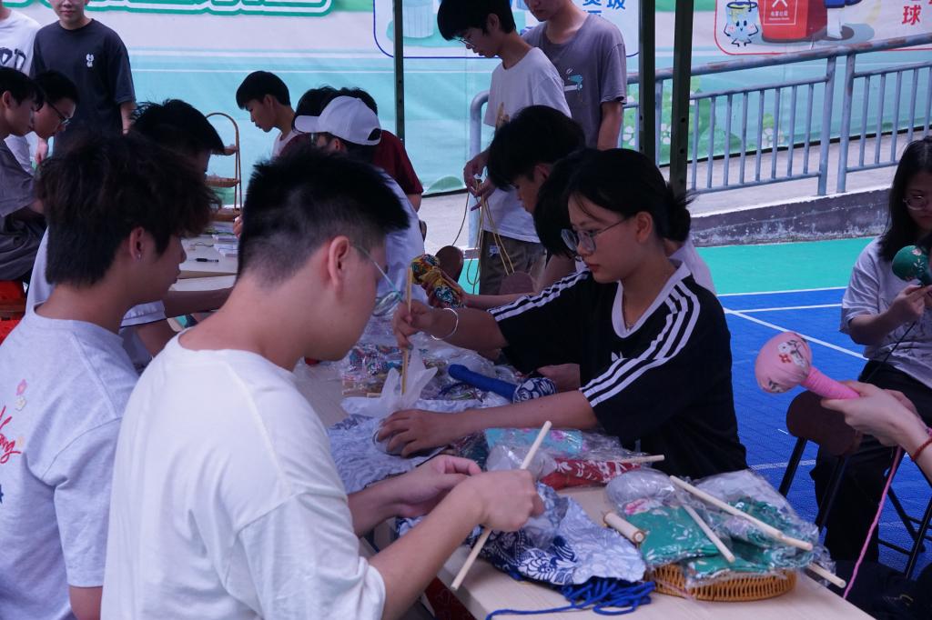 在艾草锤DIY活动区,同学们围坐桌前,亲手制作饱含心意的父亲节礼物。同学们全神贯注,从布料包裹艾草、填充压实,到棉绳缠绕固定,指尖翻飞间,一个个散发着艾草清香的养生锤逐渐成型。