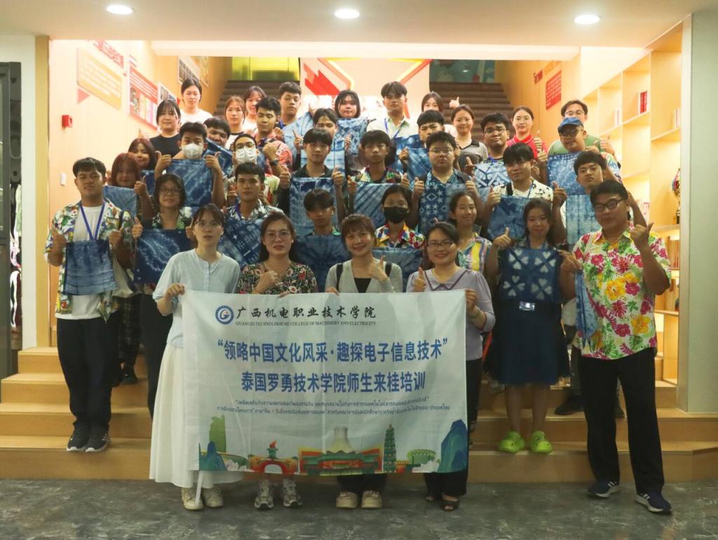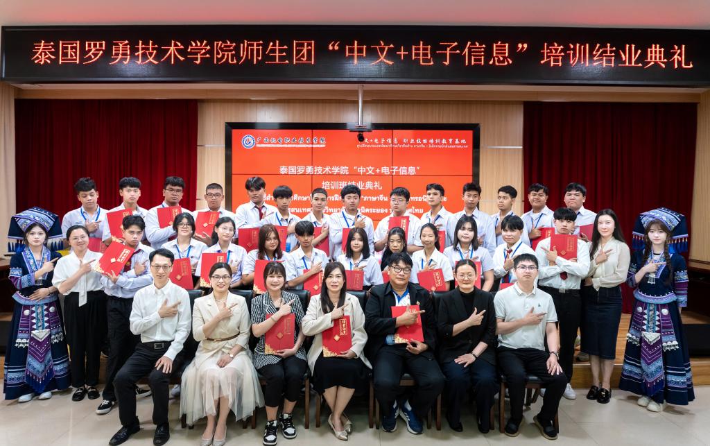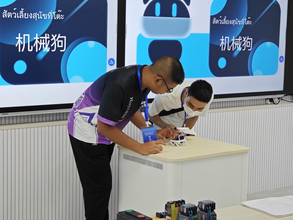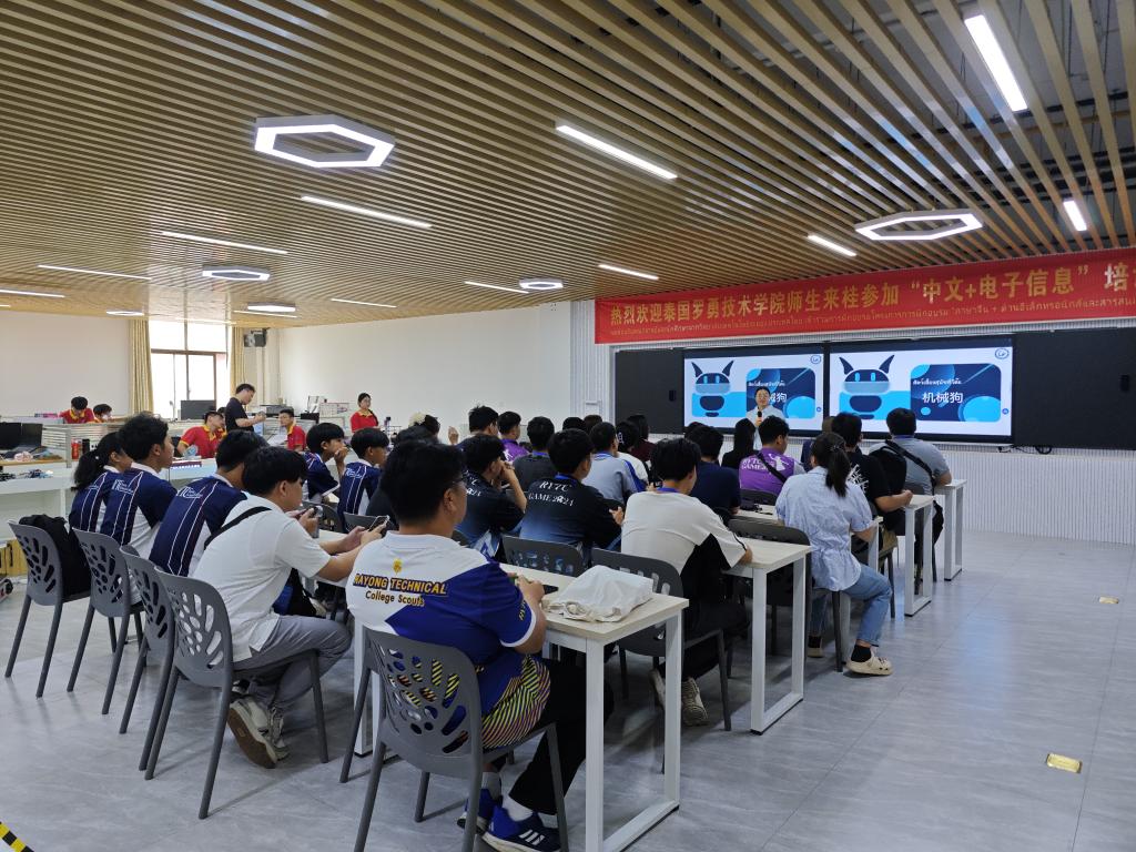 结业典礼上,一段精心制作的视频带领现场人员回顾了泰国师生培训期间学习交流的精彩瞬间和收获。在8天的培训中,泰国师生深入学习了电子信息领域的专业知识,还在实践环节中积极动手操作,在电子信息工程学院创新实训室,参与设计制作智能机器狗,将理论知识与实践紧密结合,理实一体化教学模式取得了良好成效。同时,培训班还精心安排了丰富的中国文化体验课程,学员们认真学习汉字书法,沉浸式体验竹竿舞、背篓接绣球、旱地龙舟、舞龙舞狮等民族运动项目和非遗扎染等中华文化课程,深刻感受了中华文化“和合共生”的理念,让“你好”“谢谢”等简单的中文词汇成为中泰友谊的纽带,实现了“中文+电子信息”的双向赋能。