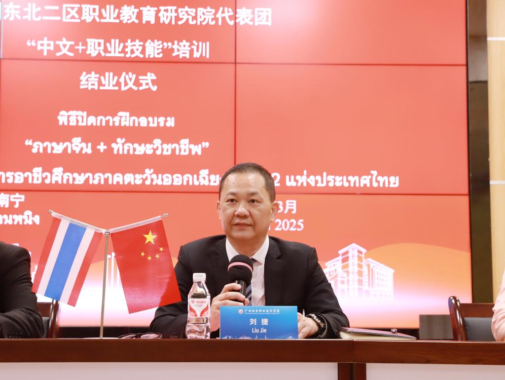刘捷在致辞中表示,依托学校“理论+实践”双轨教学模式,泰国学员们在电子信息工程学院创新实训室参与机器狗制作,在智能焊接车间学习工业机器人编程、智能焊接等前沿技术,切实感受到理实一体化的“中文+职业技能”培训的赋能效应。同时,学员们通过汉字书写、中华茶艺、非遗扎染、坭兴陶制作等课程,深入体验了中华传统文化。目前,双方已就集成电路技术、新能源汽车技术等专业达成联合培养学生的初步共识,未来将持续推进两国在职业教育领域的合作。