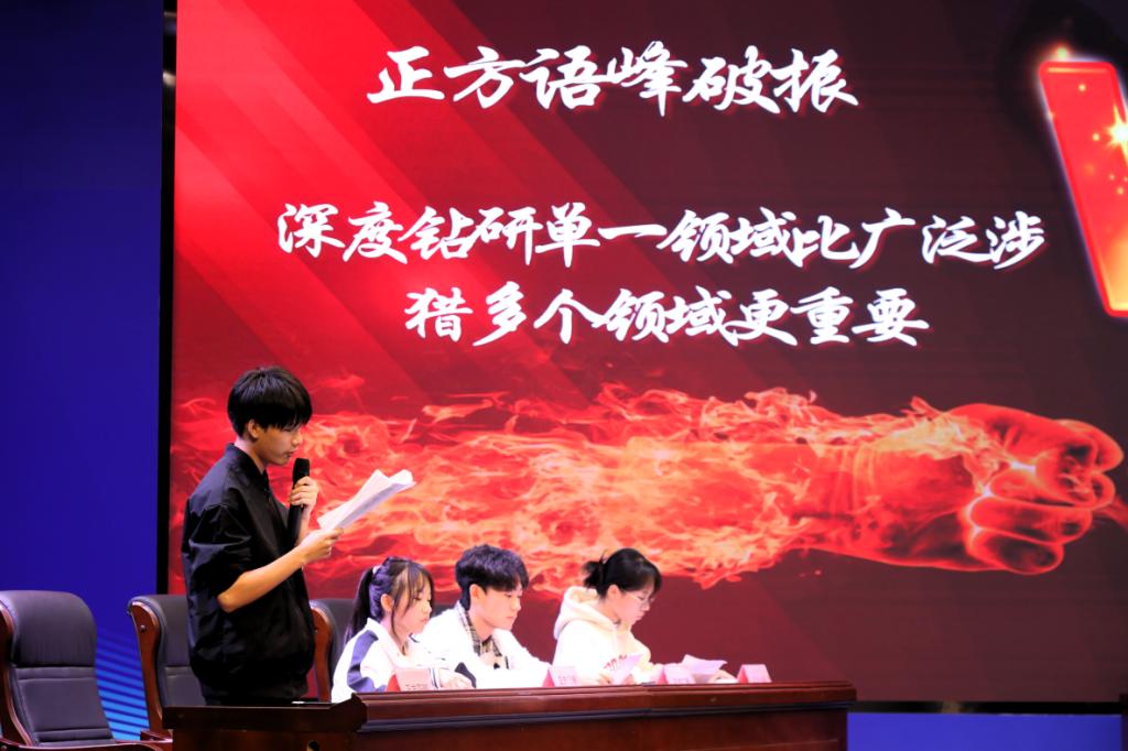 决赛现场,报告厅里气氛热烈而庄重。随着主持人宣布比赛开始,一场关于学风建设、学习方式等热点话题的辩论正式拉开帷幕。本次决赛辩题围绕“高校是否应该允许学生使用AI完成作业”、“深度钻研单一领域是否比广泛涉猎多个领域更重要”等议题展开,正反双方辩手各抒己见,展开了激烈的交锋。