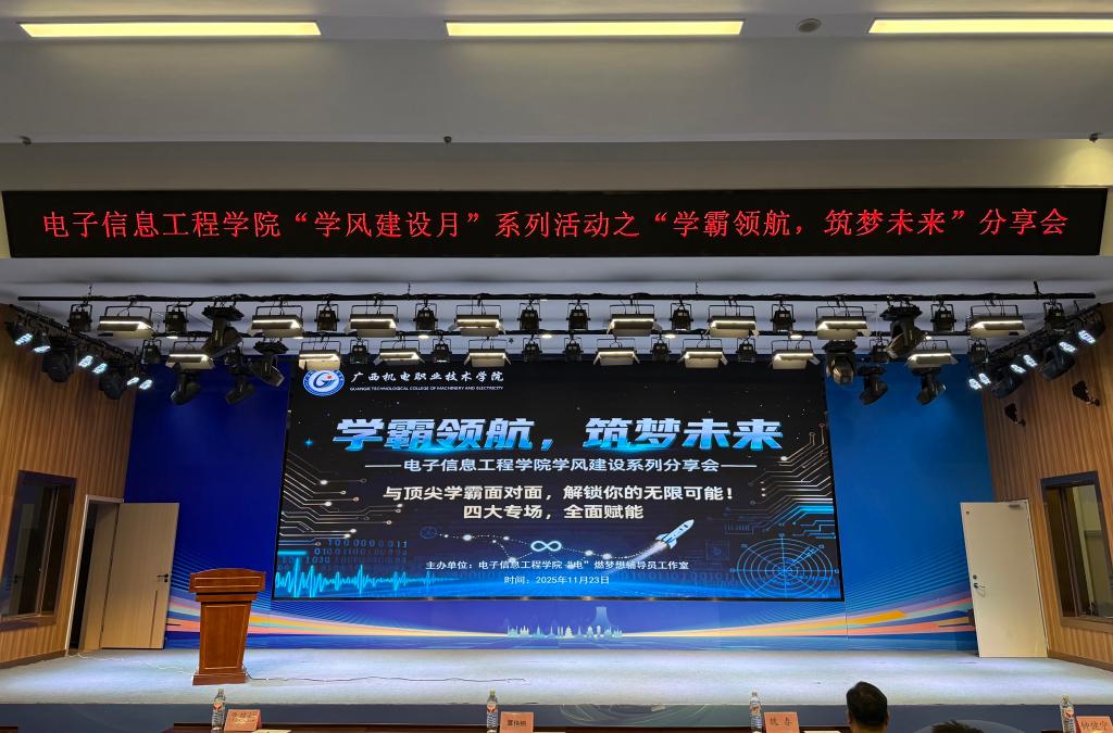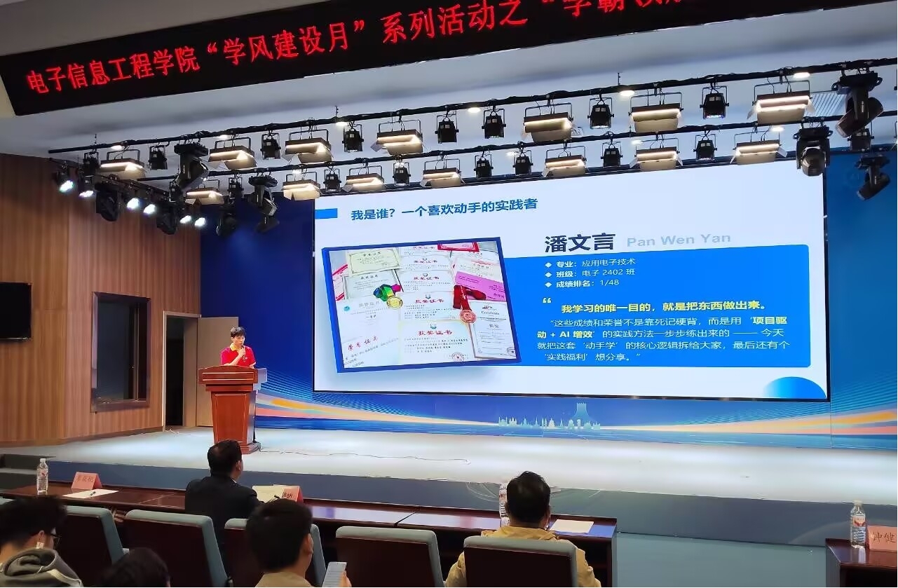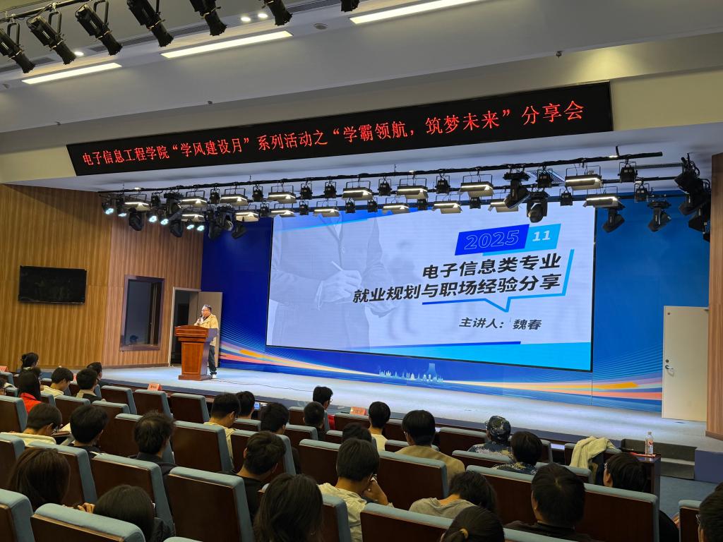 为深入推进学风建设,营造勤学笃行的育人氛围。20251123日晚,电子信息工程学院在A1-301报告厅成功举办“学风建设月”系列活动之“学霸领航,筑梦未来”学霸分享会。活动吸引全院各年级两百余名学生参与,现场气氛热烈。