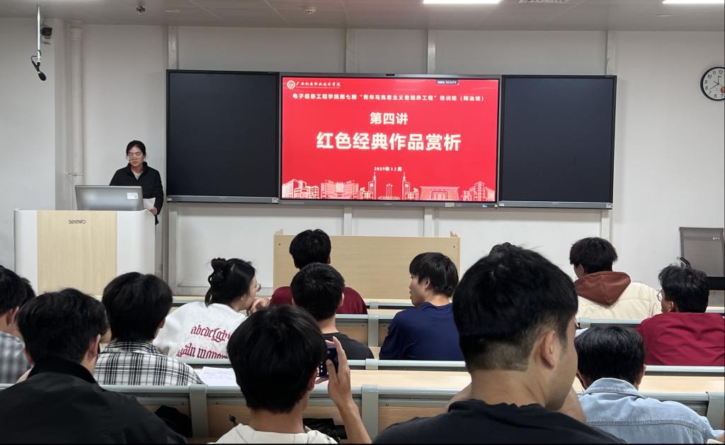 电子信息工程学院第七期“青年马克思主义者培养工程”培训班(陶冶班)第四讲——“红色经典作品赏析”于2025年12月12日顺利举行。本次讲座由学院专职辅导员邓丽捷老师主讲,以经典影片《南京照相馆》为赏析对象,带领学员们走进那段不容忘却的历史。