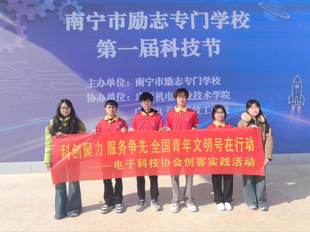 在科技强国战略深入推进的当下,播撒科学种子、培育创新精神已成为新时代教育的重要使命。为充分发挥高校专业优势,践行社会责任,助力青少年科学素养提升,2026年1月9日,电子信息工程学院电子科技协会(“全国青年文明号”)师生代表走进南宁市励志专门学校,参与该校首届科技节活动,通过特色科技展品展示与实操技能指导,为同学们带来了一场精彩纷呈的“科技盛宴”。