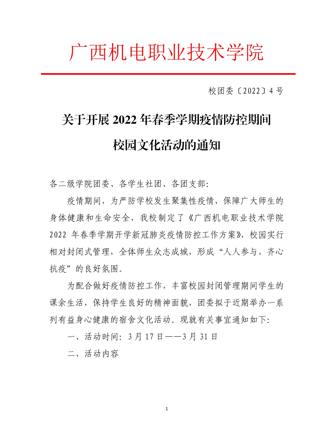 关于开展2022年春季学期疫情防控期间校园文化活动的通知