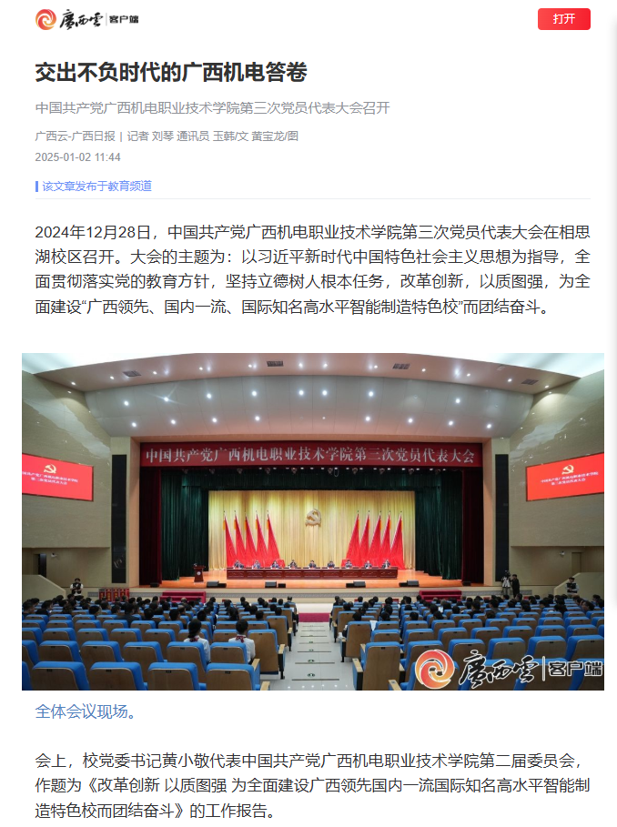 编者按:1月2日,广西云-广西日报以《交出不负时代的广西机电答卷 中国共产党AC米兰中国官网第三次党员代表大会召开》为题刊发文章,报道了AC米兰在2024年12月28日召开的第三次党员代表大会。
