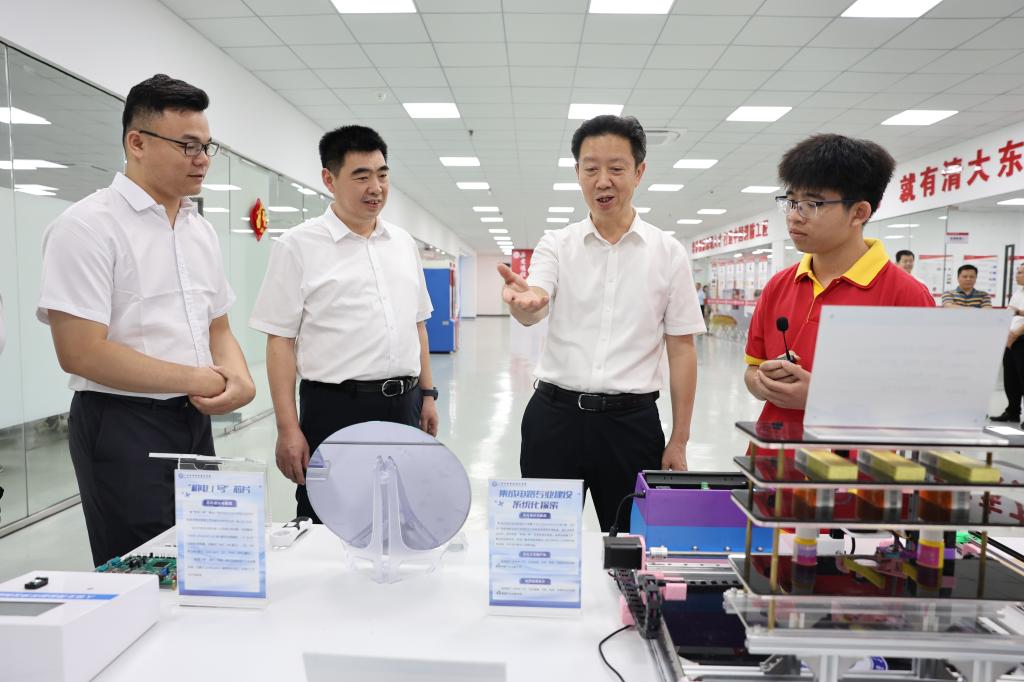 袁煌走访了学校江南校区新质生产力人才培训基地、产教融合人才培训基地和中国—东盟智能制造国际教育学院,与现场师生亲切交谈,详细了解学校在人才培养、平台建设、科技创新、实训操作、就业服务等方面情况,鼓励学校加强产教融合、校企合作,积极开展教育链-人才链-产业链“三链融合”人才培养。