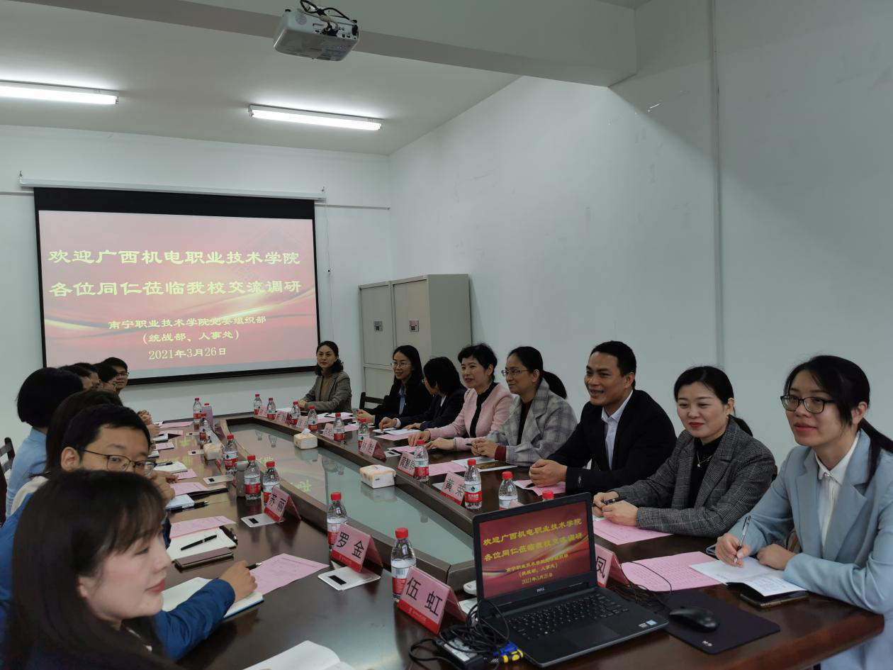 为响应学校党委号召,开阔视野、拓宽思路,学习借鉴兄弟院校基层党建和人事、人才工作先进管理理念和工作经验,3月26日上午,组织部(人事处)林胜副部长(副处长)带队,带领部门全体人员到南宁职业技术学院进行考察学习,得到南职院党委组织部(统战部、学院人事处)的热情接待。双方在南职院行政楼三楼会议室召开了座谈会,就基层党组织建设、干部工作、人事工作、人才工作等业务进行了深入探讨与交流。