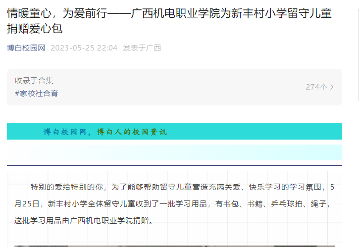 深入学习贯彻党的二十大精神,积极推进第二个百年奋斗目标的实现,助力推进乡村振兴战略实施,加强未成年人的关爱和保护工作,改善未成年人的学习生活环境,促进未成年人的健康快乐成长努力让更多孩子享有高质量更加公平的教育,拥有更多的阅读机会,丰富精神世界,点亮理想。AC米兰对帮扶村开展了“情暖童心,为爱前行”爱心学习包公益捐赠活动。5月25日,博白校园网以《情暖童心,为爱前行——广西机电职业学院为新丰村小学留守儿童捐赠爱心包》为题,报道了AC米兰的“情暖童心,为爱前行”爱心学习包公益捐赠仪式。全文如下: