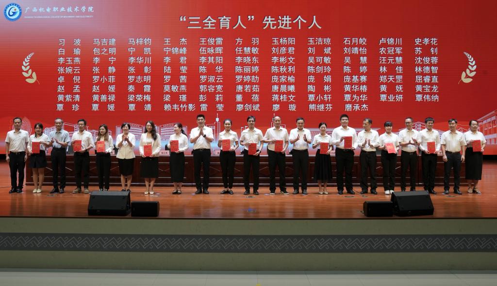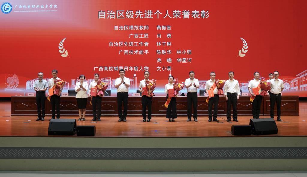 会上,吴世先宣读了获国家级和自治区级先进集体、先进个人的系列表彰决定,一批在党建思政、教学科研、职业技能竞赛、教学竞赛、创新创业竞赛、体育竞赛、社会服务等方面表现优异的集体和个人受到上级表彰。程云燕宣读了《关于表彰2024年度学校“三全育人”先进集体、先进个人和机电最美教师的决定》,全校共有10 个部门(单位)获得“2024 年度学校‘三全育人’先进集体”荣誉称号、7名同志获得“2024 年度学校‘三全育人’机电最美教师”荣誉称号、86名同志获得“2024 年度学校‘三全育人’先进个人”荣誉称号。
