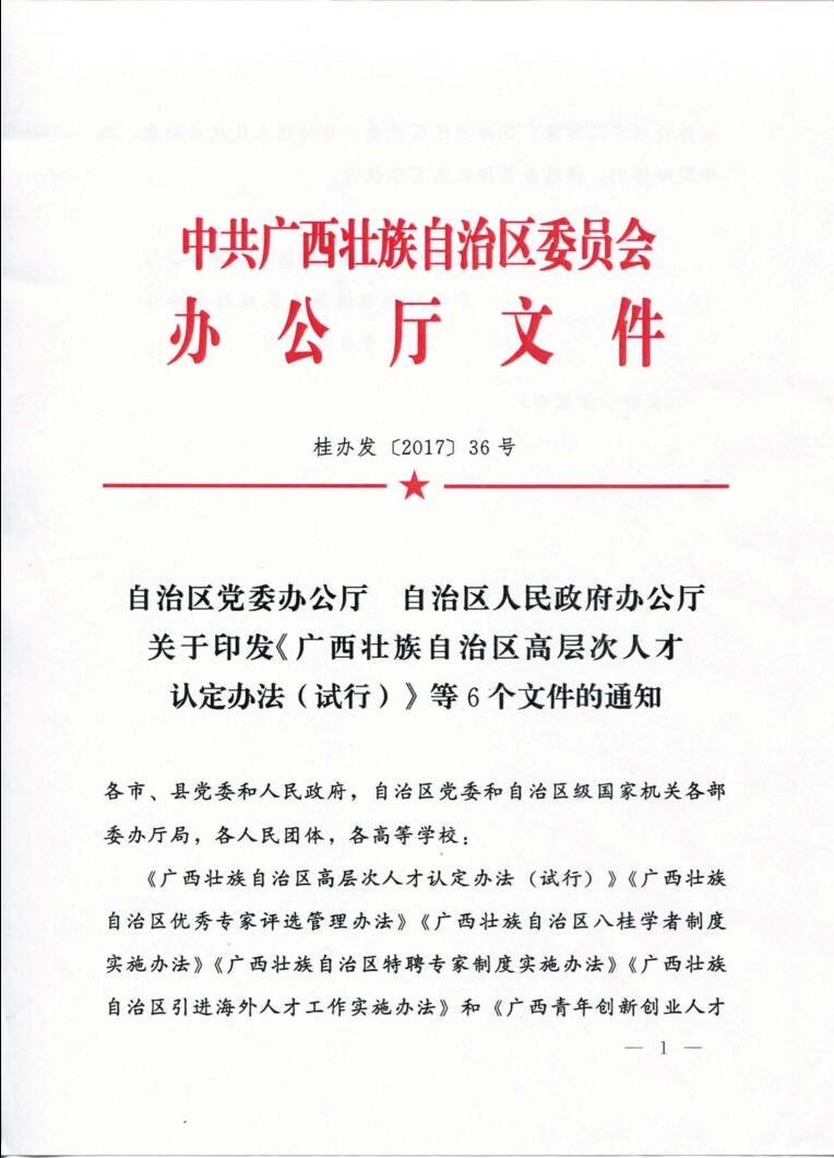 关于印发《广西壮族自治区高层次人才认定办法(试行)》等6个文件的通知