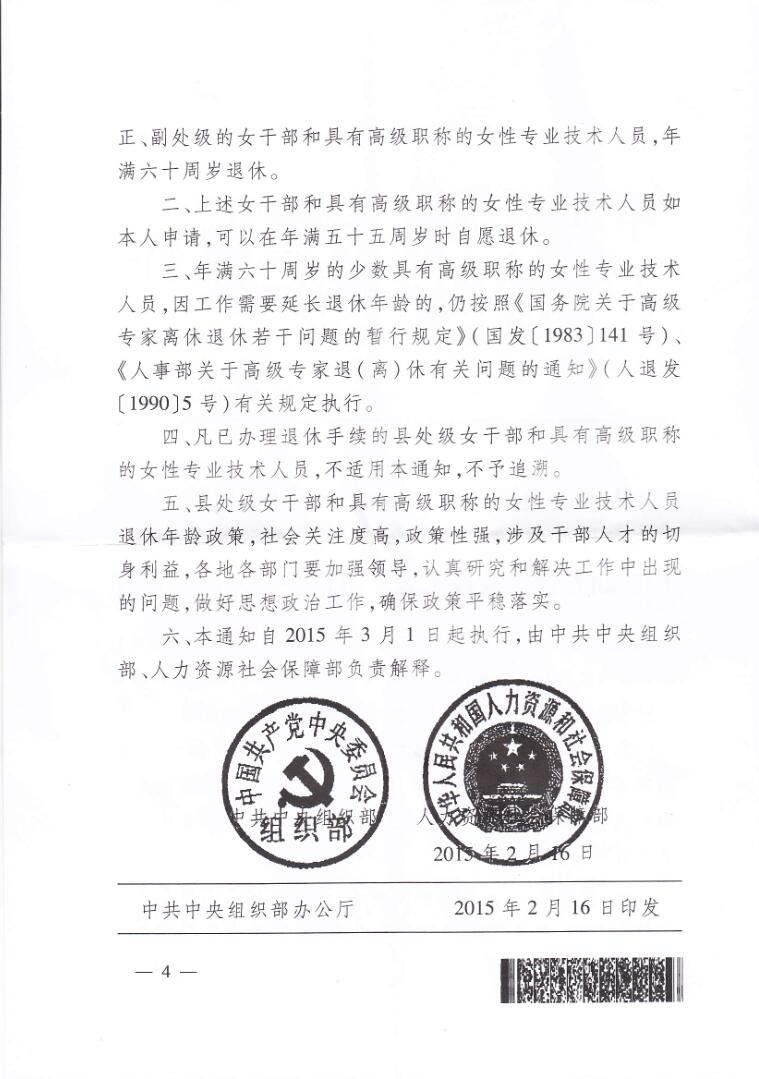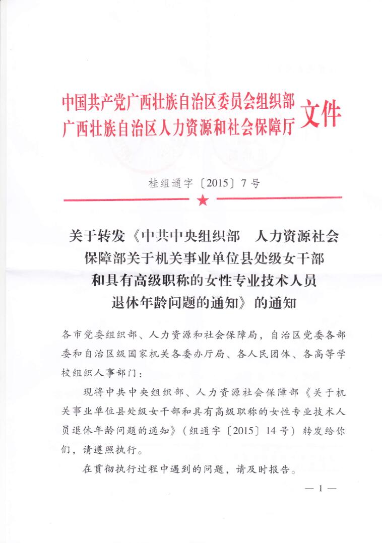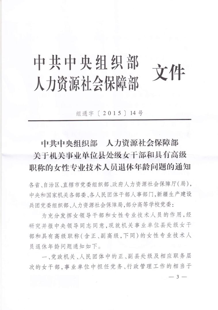 关于转发《中共中央组织部 人力资源社会 关于机关事业单位县处级女干部和具有高级职称的女性专业技术人员退休年龄问题的通知》的通知