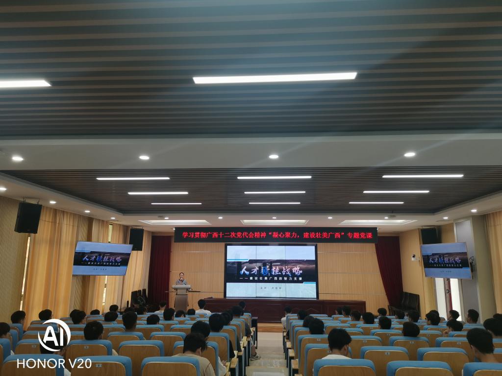 为学习贯彻广西十二次党代会精神,凝心聚力建设壮美广西,6月14日下午,机械工程学院学生党支部在第六教学楼第二学术报告厅开展专题党课。全体师生党员同志、入党积极分子参加学习。专题党课由支部书记梁荣梅主持,组织员卢思桥主讲。