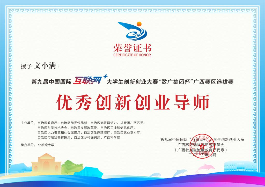 在教育教学改革和各类竞赛中,文小满同样收获满满,他在2024年5月荣获自治区级职业教育教学成果奖一等奖2项;指导学生参加2024首届全国大学生职业规划大赛获得国赛铜奖;指导学生参加第九届中国国际“互联网+”大学生创新创业大赛获得国赛铜奖;指导学生获第七届中华职业教育创新创业大赛广西赛区高职组铜奖。此外,2023年以来他还主持校级党建课题1项,主编“三全育人”专著1本,发表论文3篇;获得国家实用新型专利2件。