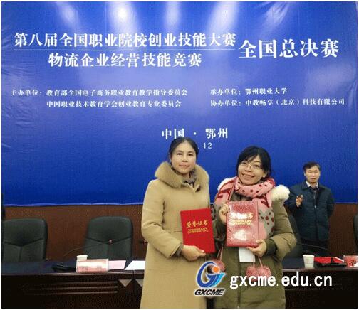 近日,第八届全国职业院校创业技能比赛——物流企业经营技能竞赛全国总决赛在湖北举行。来自全国81所高职院校的139支代表队参加了角逐。由我院工商管理系梁军、赵凡老师组成的教师代表队获教师组二等奖;由物流专业李付勋、叶海龙、宁必铮、阙宗斌组成的学生代表队夺得学生组一等奖。这是我院物流管理专业首次在此项全国大赛中获一等奖,实现了历史性的突破。