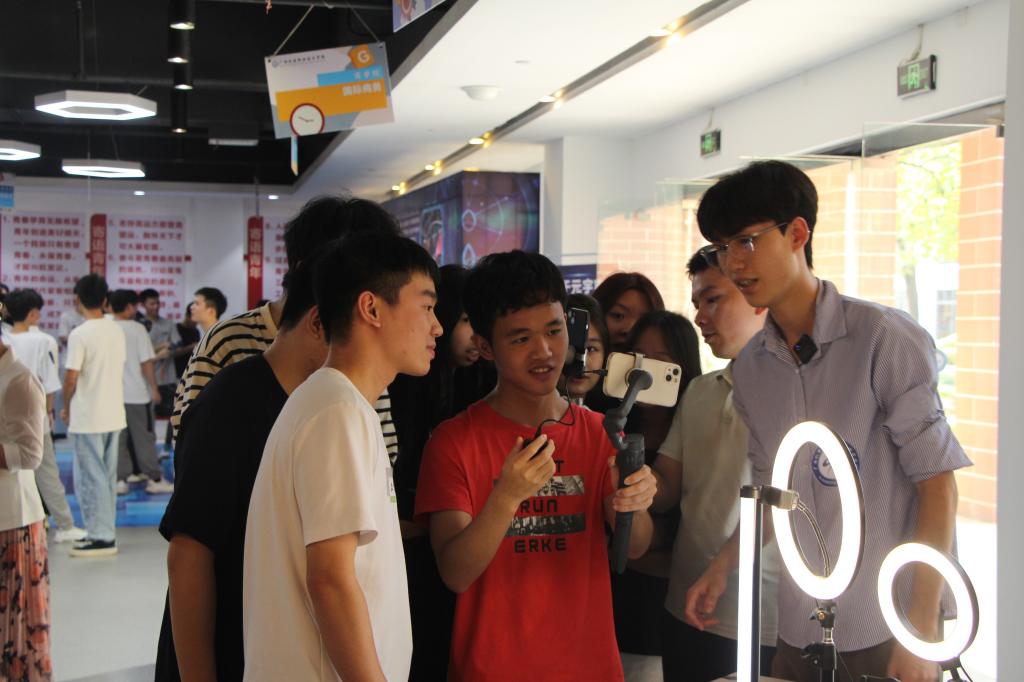 本次活动还设立了直播设备体验区,手持棒灯、补光灯、相机、手持云台、领夹式无线麦克风、拍摄灯箱等各式各样的专业设备展示,吸引了同学们的注意力,同学们纷纷上手体验,乐此不疲。