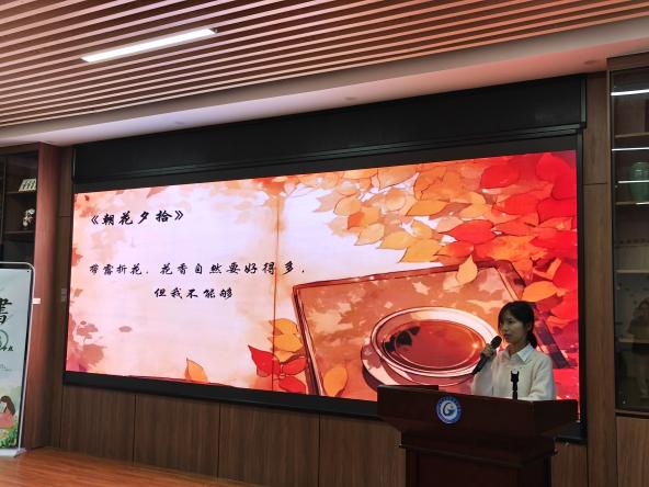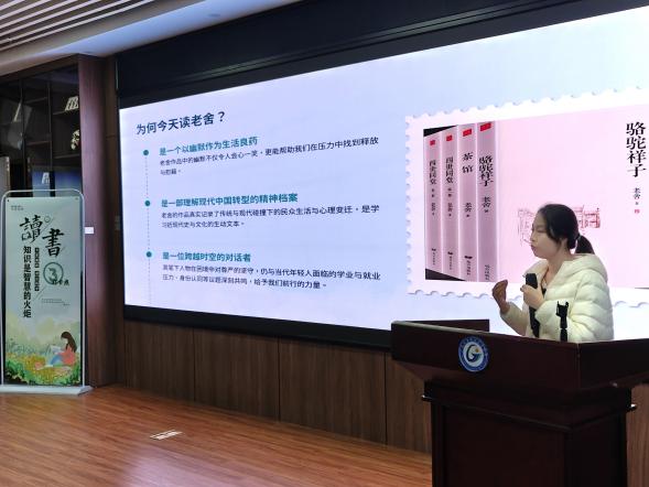活动现场,经过前期评选脱颖而出的3名学生代表依次登台分享阅读心得。来自现代商贸物流学院的莫志敏以老舍的《烟火人间》为例,谈文字描绘出的人间百态,让她领悟到,无论身处何种困境,都应坚守理想,在学习与生活中勇敢面对挫折;文化旅游与管理学院的李华霞推荐《朝花夕拾》,她指出,《朝花夕拾》虽为鲁迅的回忆性散文集,但让我们看到文明发展进程中教育理念的变革,让大家意识到在时代进步中传承与创新文化的重要性;现代商贸物流学院的李明金则以《城南旧事》为切入点,呼吁青年学子扎根文化土壤,汲取其中的精神力量,在现代社会中传承和弘扬优秀传统文化,让传统与现代和谐共生。三位同学的分享逻辑清晰、情感真挚,展现了新时代大学生的阅读视野与思想深度,赢得阵阵掌声。