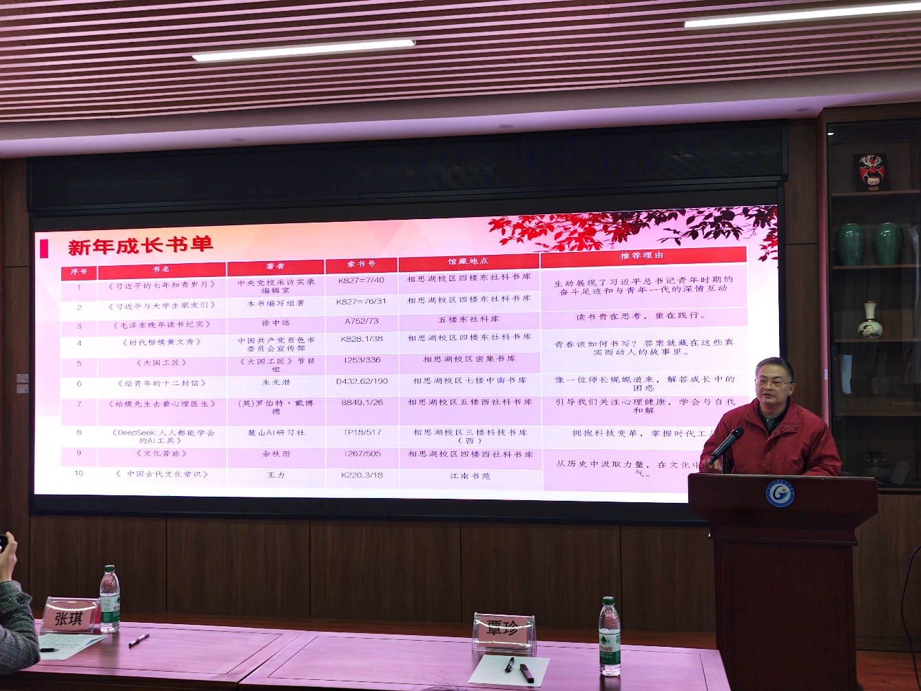 学校图书馆馆长甘宜沅教授则为活动作新年成长书单推荐。他结合当前社会发展趋势与学生成长需求,精选《习近平的七年知青岁月》《习近平与大学生朋友们》《大国工匠》等10部著作,鼓励从“读懂中国”“青年成长”“科学思维”三个维度解读书籍价值,并寄语同学们“以书为伴,以梦为马,在阅读中遇见更好的自己,在奋斗中书写无愧于时代的青春篇章!”。其推荐内容兼具思想性与实用性,不少师生用手机拍下推荐书单,为师生提供了清晰的阅读指引。