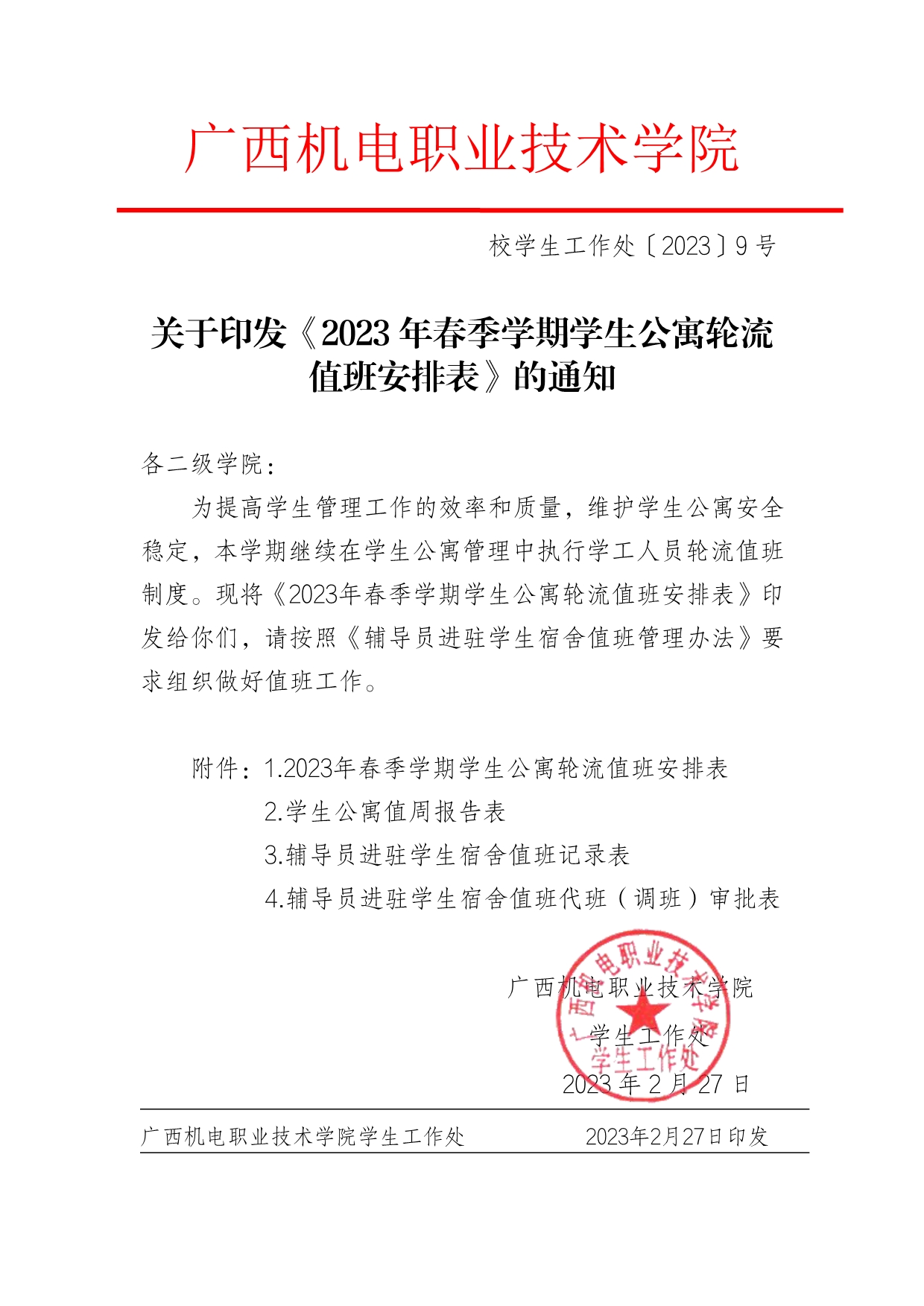 关于印发《2023年春季学期学生公寓轮流值班安排表》的通知