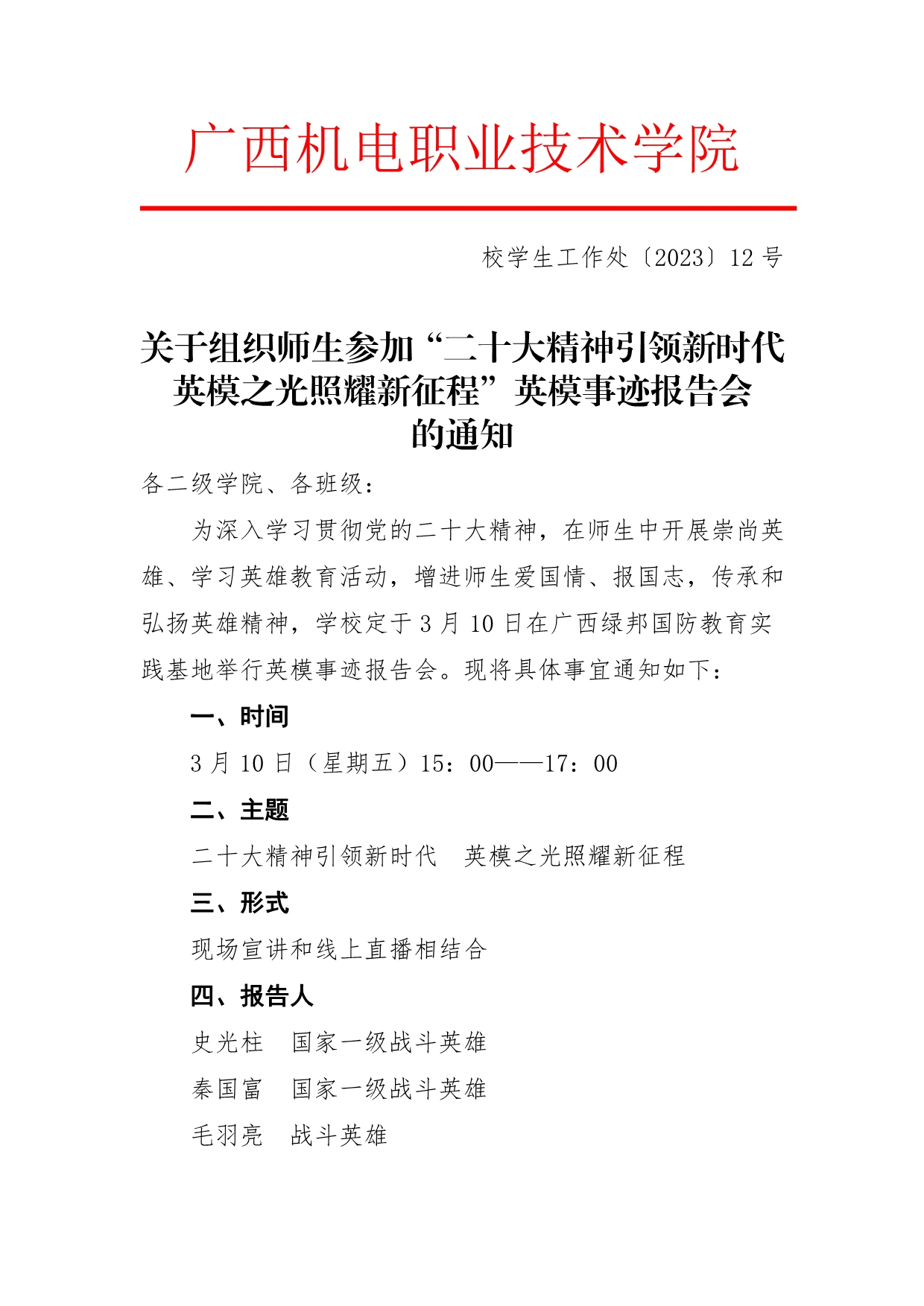 关于组织师生参加“二十大精神引领新时代 英模之光照耀新征程”英模事迹报告会的通知