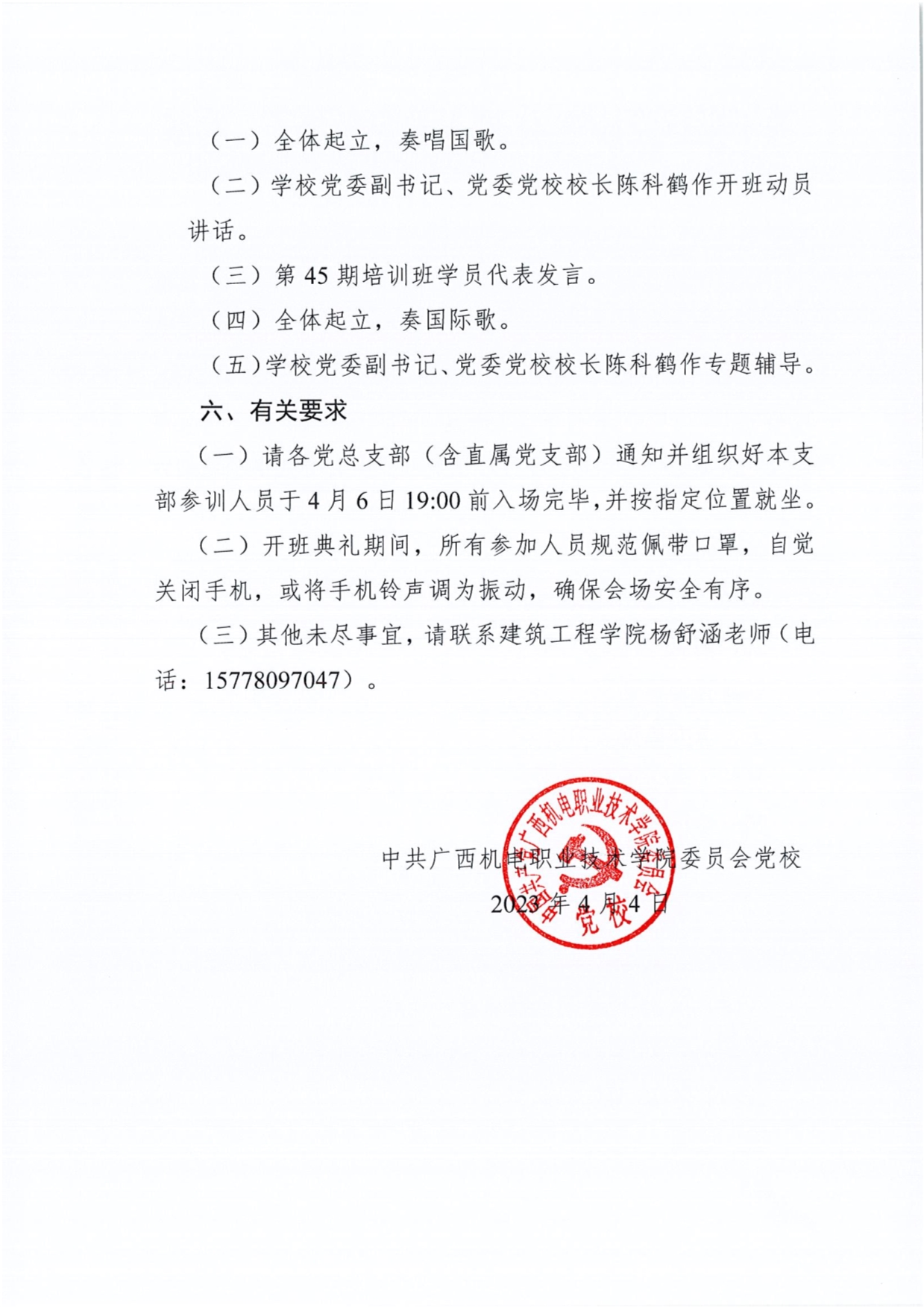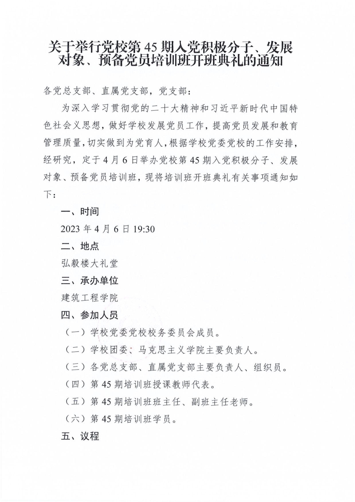 关于举行党校第45期入党积极分子、发展对象、预备党员培训班开班典礼的通知