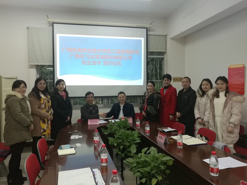 2019年1月10日,我院与广西先飞达物流股份公司签署校企合作协议。广西先飞达物流股份公司董事长黄结业、董事黄智心、董事杨燕妮、财务副总杨燕秋、工商管理系主任韦传亮、系副主任刁爱华和物...