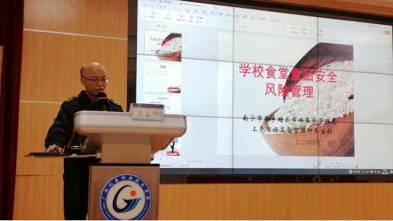 培训中,韦宝创副所长深刻剖析了校园食品安全的重要性,明确指出食品安全不仅关系到师生的身体健康,更关乎学校的稳定发展,是校园管理工作中不可或缺的重要环节。他围绕食品经营许可、从业人员健康管理、食品规范贮存、食品添加剂使用、加工制作过程控制以及生产经营场所和设施清洁维护等多个核心环节,进行了深入浅出的讲解。同时通过生动的案例分析,对餐饮服务单位的重点环节进行了深入剖析,使参训人员更加直观地认识到食品安全管理的重要性和必要性。