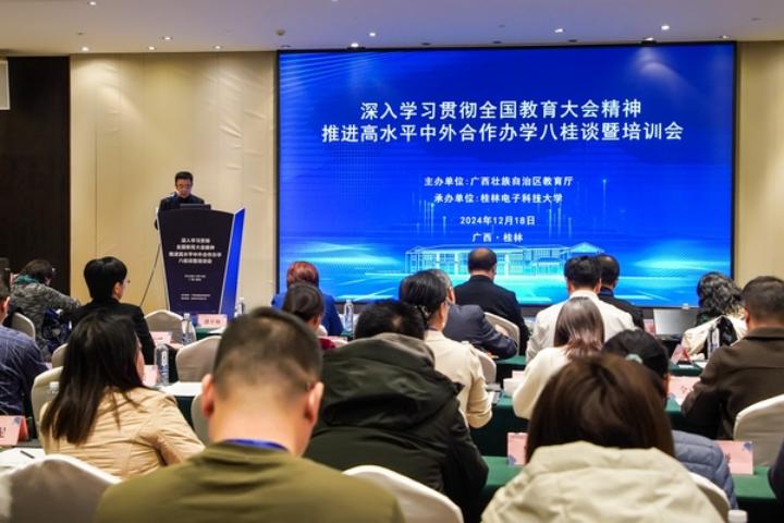 本次会议由广西壮族自治区教育厅主办,桂林电子科技大学承办。自治区教育厅党组副书记、副厅长闫炳辰出席会议。此次会议是我区首次召开的高规格、高标准、国际化的中外合作办学领域培训会,更是贯彻落实全国、全区教育大会精神,聚焦经济社会发展,发挥广西独特区位优势,通过高水平中外合作办学,推动教育交流合作、推动“一区两地一园一通道”战略实施的重要举措;是服务新质生产力、人工智能低空经济,为推动构建世界教育中心、中国—东盟命运共同体贡献广西力量的重要渠道。
