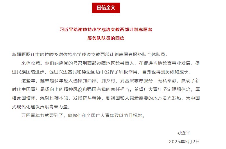 在五四青年节到来之际,中共中央总书记、国家主席、中央军委主席习近平给新疆克孜勒苏柯尔克孜自治州阿图什市哈拉峻乡谢依特小学戍边支教西部计划志愿者服务队全体队员回信,向全国广大青年致以节日祝贺并提出殷切期望,勉励青年“到祖国和人民最需要的地方发光发热,为中国式现代化建设贡献青春力量”。