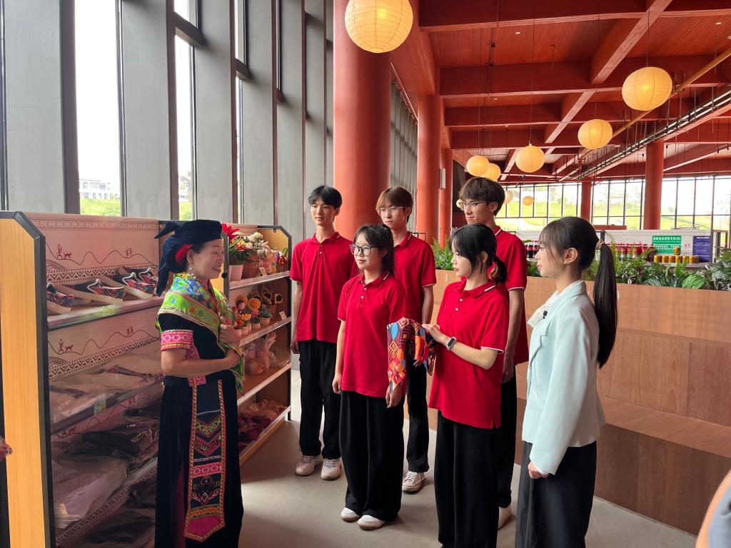 在花山岩画数字化展厅,师生通过三维扫描、VR影像等技术,零距离感受岩画细节:斑驳崖壁上的原始纹路经数字化复原后动态呈现,千年祭祀场景以光影叙事形式立体还原。当触控屏上的岩画随历史年轮层层展开时,师生们沉浸式完成了一场跨越时空的文明对话。文创展厅内,印有岩画“蹲式小红人”的文创产品令人眼前一亮:真丝丝巾将岩画纹样转化为流动的艺术,磁吸冰箱贴让古老符号化身萌趣日常,帆布包上的几何图案与现代设计碰撞出独特美感。这些将传统文化解码重构的创意作品,既保留了岩画的神秘基因,又注入了当代审美活力。“原来数字技术能让文化遗产‘开口说话’!”物联网专业学生李哲指着实时生成保护数据的大屏表示,“我们可以用区块链技术记录岩画修复历程,用AR技术还原创作场景,让文化传承搭上科技快车。”