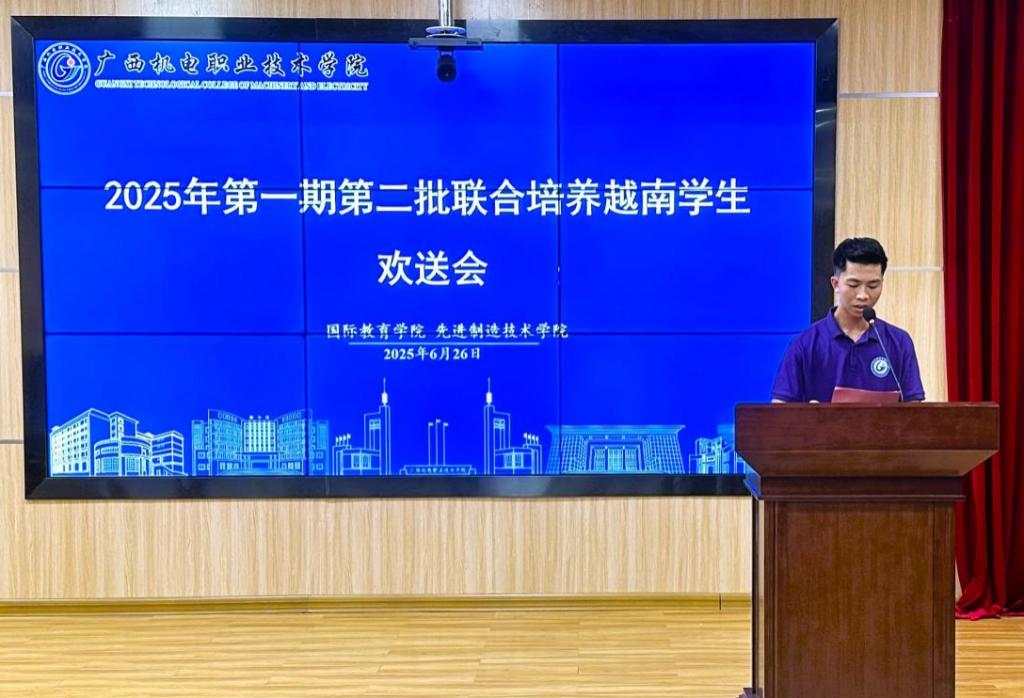 刘捷在致辞中向圆满完成学习任务的同学们致以热烈祝贺。他指出,学校举办“校-企-校”中越联合培养“中文+技能”项目,是学校推进“职教出海、教随企出”的重要成果,更是深化中越职业教育合作的关键实践。通过半年的朝夕相处,两国师生不仅实现了专业知识的互鉴共进,更以心相交,生动诠释了“中越山水相连、文化相通”的深厚情谊。他殷切希望越南同学回国后,能成为中越友谊的传承者、企业发展的助力者、终身学习的奋斗者,以智慧和汗水为中越两国发展及人类进步事业贡献力量。